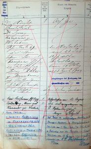 Die zweite Frage stellt sich im Hinblick auf den Zeitpunkt seiner Anmeldung in Wiesbaden und damit verbunden das Jahr seiner Eheschließung. Auf der 1920 erstellten Liste der polnischen Juden ist auch seine Frau Mina, geborene Hanauer, mit dem gleichen Meldedatum, dem 10. Mai 1906, aufgeführt. Laut Eintrag auf seiner Sterbeurkunde war die Ehe aber erst am 26. Dezember 1907 geschlossen worden.[10]