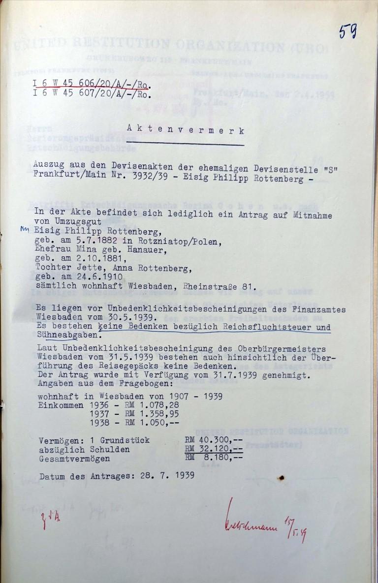 [3] HHStAW 518 867 (14). Die Notiz basiert auf der Angabe, die Philipp Rottenberg in seiner Devisenakte 1939 selbst gemacht hatte, siehe HHStAW 519/3 21295 (2). ). Im Erinnerungsblatt des Aktive Museum Spiegelgasse wird diese Summe fälschlicherweise als die gezahlte Judenvermögensabgabe und Reichsfluchtsteuer angesehen. Erstens musste zumindest die Judenvermögensabgabe bereits gezahlt worden sein, sonst wäre die Unbedenklichkeitsbescheinigung nicht ausgestellt worden. Sie konnte also hier nicht mehr als Schuld angegeben sein. Zweitens hätte angesichts der Summe das bisherige Gesamtvermögen mehr als 120.000 RM ausgemacht haben müssen, denn mit der 5. Rate war insgesamt ein Viertel davon, also grob 30.000 RM zu zahlen.