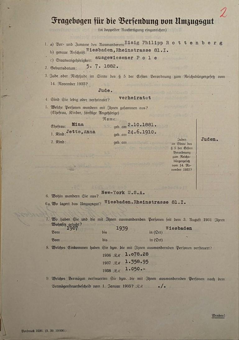 Offenbar hatten die drei noch in Deutschland verbliebenen Familienmitglieder ebenfalls ihre Emigration geplant. Am 28. Juli 1939 ging bei der Devisenstelle in Frankfurt der entsprechende Antrag auf Mitnahme von Umzugsgut ein.[64] Als Ziel war New York angegeben. In den Unterlagen für die Emigration lagen auch zwei Unbedenklichkeitsbescheinigungen, eine von der Stadt, die andere vom Finanzamt, laut denen Rottenbergs allen steuerlichen Verpflichtungen nachgekommen waren. Das bedeutet, dass sie sowohl die Judenvermögensabgabe als auch die Reichsfluchtsteuer bezahlt haben mussten. Belege über deren Höhe und mit welchen Mitteln sie wann bezahlt wurden, sind aber nicht erhalten geblieben.[64a]