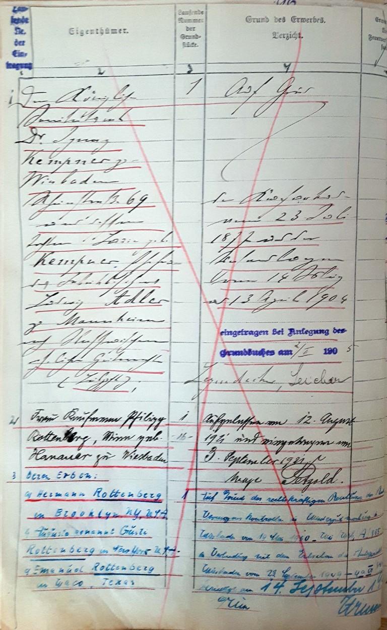 Einschränkend muss man allerdings festhalten, dass zwar der Kaufmann Philipp Rottenberg wahrscheinlich die treibende Kraft beim Erwerb war, das Haus aber formal nur seiner Frau Mina gehörte. Im Grundbuch ist als Besitzer in einer etwas umständlichen Formulierung „Frau Kaufmann Philipp Rottenberg, Mina, geb. Hanauer zu Wiesbaden“ eingetragen.[2]