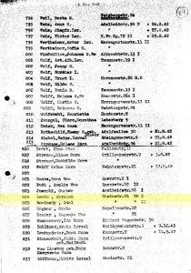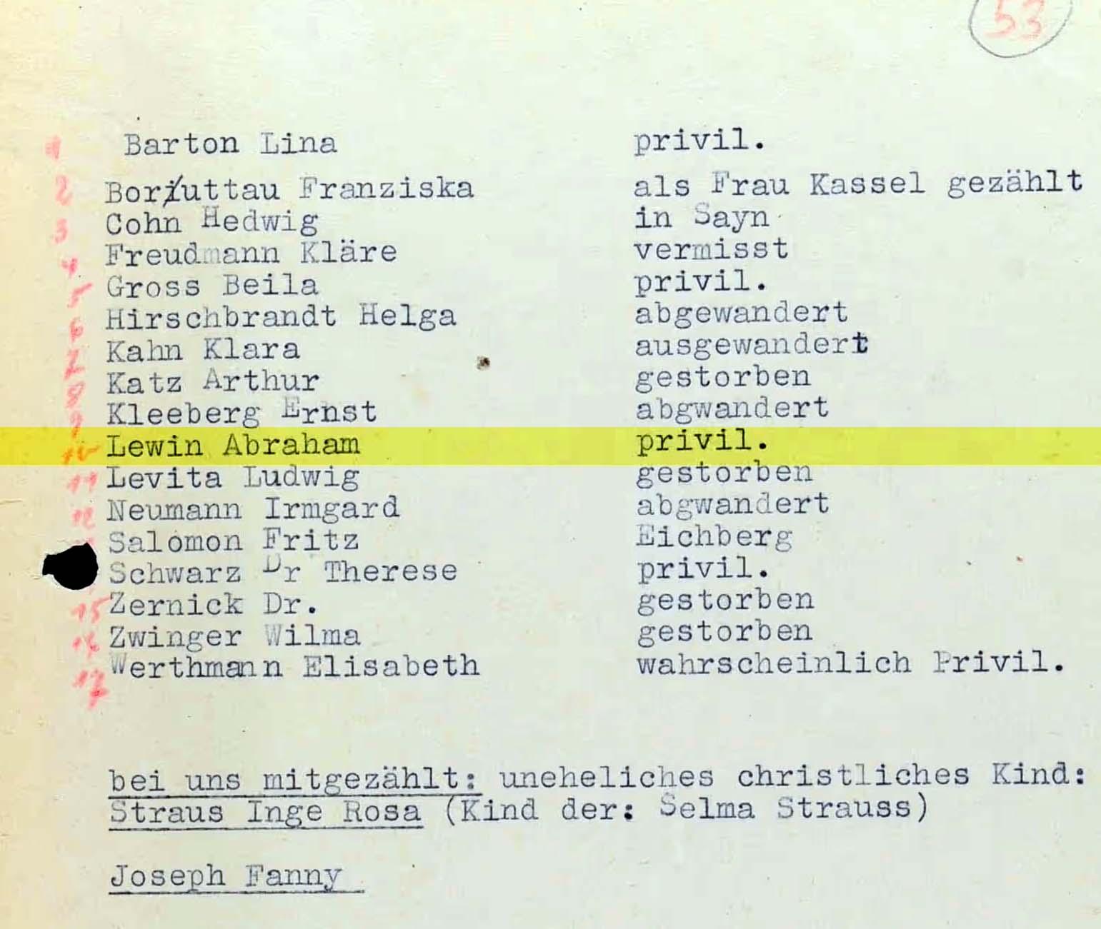 Der Grund, weshalb er selbst stattdessen in eine neue Wohnung übersiedelte, ergibt sich aus einer ebenfalls undatierten Liste, die vermutlich auch im Büro der Bezirksverwaltung der ‚Reichsvereinigung‘ erstellt worden war. Aufgelistet sind darin 17 Personen, die vermutlich ursprünglich für den Transport vorgesehen waren, dann aber aus unterschiedlichen Gründen nicht deportiert wurden – manche waren inzwischen verstorben, abgewandert oder aus anderen Gründen nicht greifbar –. Bei vier Namen ist der Vermerk „privilig“ zu lesen, darunter auch bei Abraham Lewin.[6] Daraus ist zu schließen, dass er einmal, vielleicht sogar noch immer, verheiratet war, und sogar Vater von mindestens einem Kind war. War nämlich der männliche Partner einer Mischehe Jude, dann erhielt die Ehe gemäß der kruden patriarchalischen NS-Ideologie nur diesen Status, wenn auch Kinder vorhanden waren, die zudem christlich erzogen worden sein mussten. Wer die christliche Partnerin war, ob sie selbst und ob die Kinder noch lebten, ist nicht bekannt. Aber immerhin blieb Abraham Lewin auf diese Weise damals noch verschont.