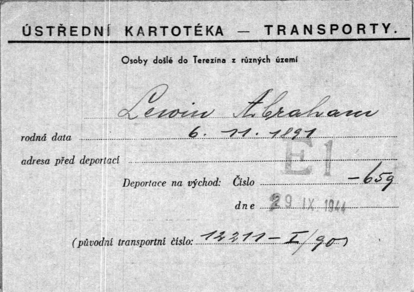 Abraham Lewin und Idel Rawinsky blieben aber nur kurz in Frankfurt. Schon am 16. März wurden sie mit einem Transport, der 41 Juden umfasste, nach Berlin gebracht. Unmittelbar nach ihrer Ankunft beförderte sie ein Zug, der die Bezeichnung I/90 trug, mit insgesamt etwa 1 300 Insassen in das Ghetto Theresienstadt.[9] Während Idel Rawinsky das Ghetto überlebte und nach seiner Befreiung sogar nach Wiesbaden zurückkehrte, wurde Abraham Jakob Lewin am 29. September 1944 mit dem zweiten von insgesamt vier Transporten, die innerhalb weniger Tage – vom 28. September bis zum 4. Oktober – 6 000 Menschen nach Auschwitz brachten, den dortigen Gaskammern zugeführt.[10]