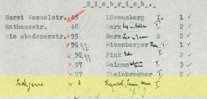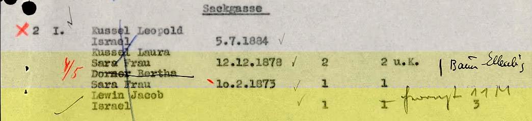 Es muss sich um ein eher kleines Haus gehandelt haben, denn die Eigentümer bewohnten dort selbst nur 2 Zimmer. Im Laufe des Jahres 1939 waren dann zwei neue jüdische Mieter hinzugekommen: Zum einen die frühere Weißwarenhändlerin Bertha Dorner, zum anderen Abraham Jakob Lewin. Beide hatten jeweils ein Zimmer im ersten Stock des Hauses bezogen, wie aus einer im November 1939 erstellten Wohnungsliste hervorgeht.[3] Auch in einer weiteren Liste vom Sommer 1941 sind noch beide als Bewohner des Hauses eingetragen, allerdings ist bei Bertha Dorner schon der handschriftliche Vermerk „Baum, Ellenb’g“ nachgetragen.[4]