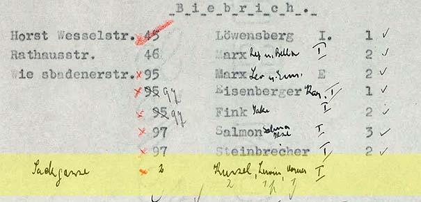 Was die weitere Wohnsituation in der Sackgasse betrifft, so sind die Angaben dazu widersprüchlich. In der Liste über den freigewordenen Wohnraum in der Sackgasse 2 nach der Deportation im Juni 1942 heißt es, dass nach dem 10. Juni alle 4 Zimmer nicht mehr belegt gewesen seien. Demnach hätte auch Abraham Lewin das Haus inzwischen verlassen haben müssen, was aber laut seiner Karteikarte nicht der Fall war. Sein Umzug in die Rheinstr. 81 erfolgte demnach erst am 28. Juli 1942, d.h., an dem Tag, an dem sich die zumeist älteren Jüdinnen und Juden in der ehemaligen Synagoge in der Friedrichstraße zur Vorbereitung für ihren Transport nach Theresienstadt einzufinden hatten.