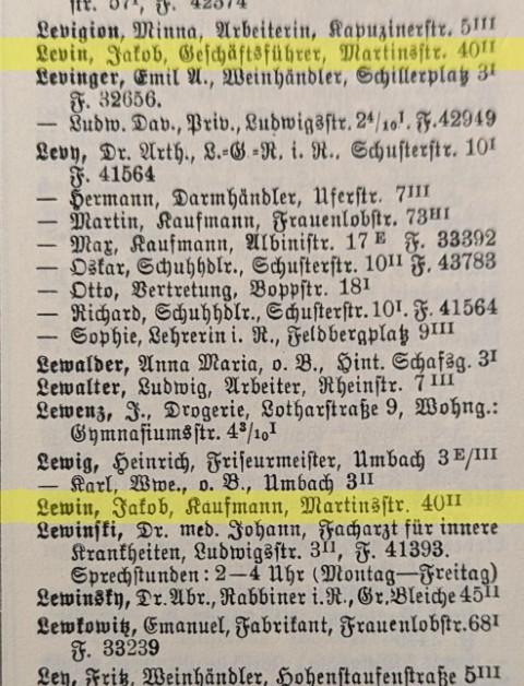 Allerdings war er selbst bereits 1922 verstorben, die Firma lief aber noch weiter auf seinen Namen. Während die Witwe nach dem Tod ihres Mannes in der Mainzer Taunusstr. 7 gezogen war, wohnte Jakob Lewin fast zehn Jahre in der Martinsstr. 40. Möglicherweise hatte er in all diesen Jahren in dem Betrieb seines ehemaligen, längst verstorbenen Vermieters die Funktion eines Geschäftsführers ausgeübt. 1938 musste er im Zuge der Maßnahmen zur „Entjudung“ der deutschen Wirtschaft dann diese Stellung, sollte er sie gehabt haben, unweigerlich verlieren. Das könnte der Anlass für seinen damaligen Umzug nach Wiesbaden gewesen sein, aber das bleibt eine vage Vermutung.