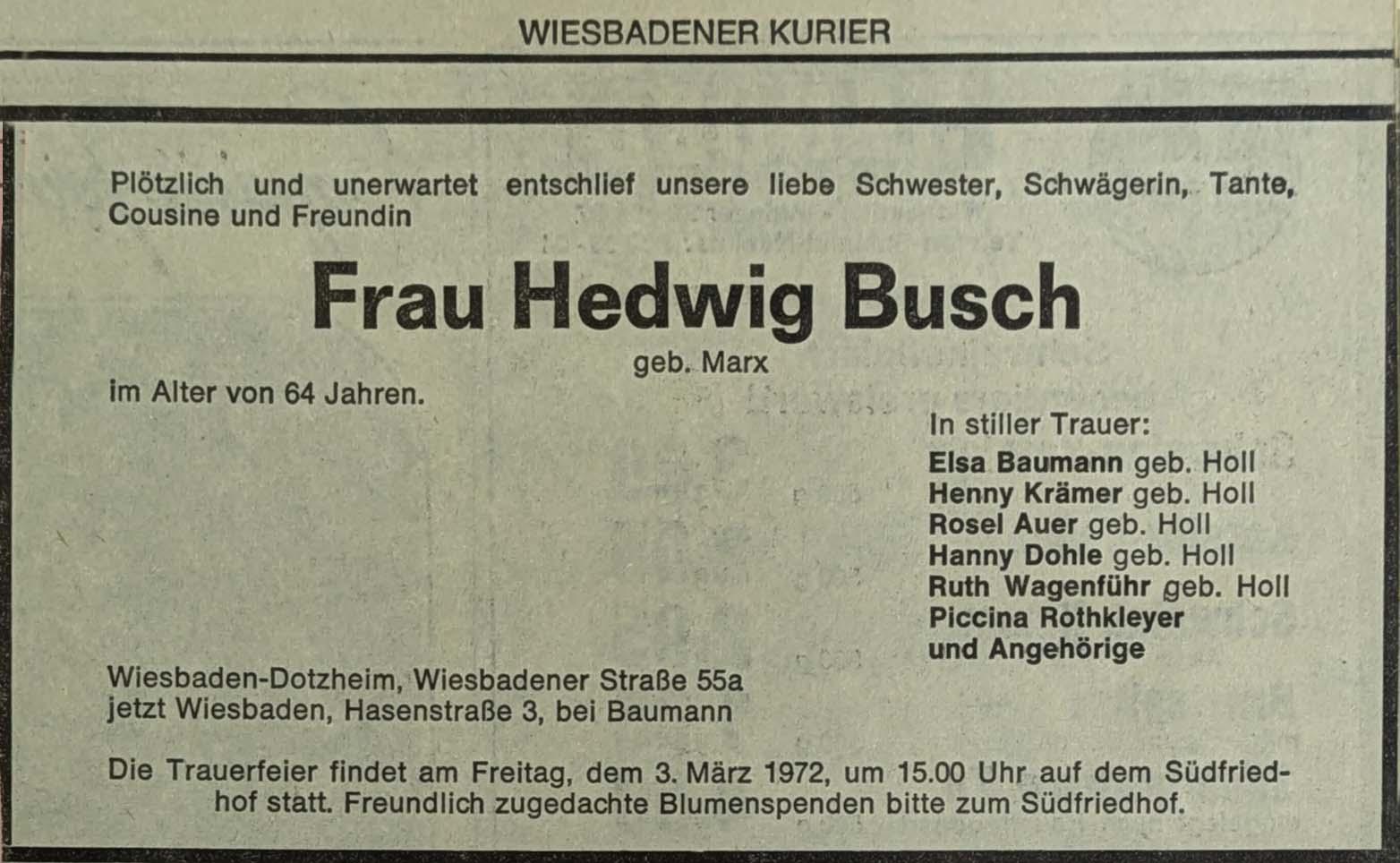 [63] Sterberegister Wiesbaden 524 / 1972. Wann ihr Ehemann Wilhelm Busch verstarb, konnte nicht ermittelt werden, aber sie wird in dem Sterbeeintrag als Witwe von Wilhelm Busch bezeichnet.