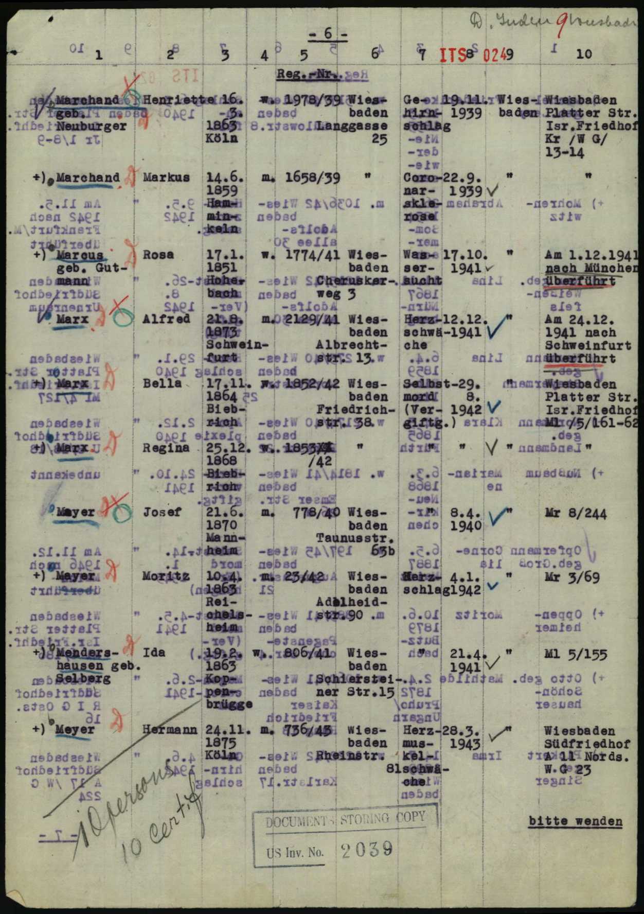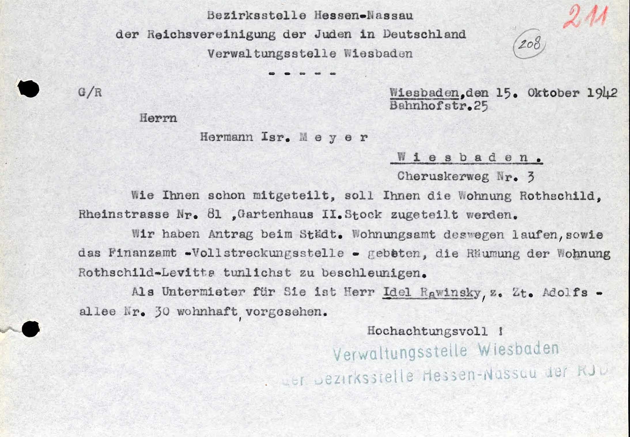Dieser Umzug und weitere damit verbundene Umzüge anderer Personen gehören zu den wenigen, die mit entsprechenden Anweisungen dokumentiert sind. Es handelt sich dabei um drei am selben Tag, dem 15. Oktober 1942, verfasste Schreiben, die aber nicht im Wohnungsamt oder bei der Polizei bzw. Gestapo entstanden waren, auch nicht um Anweisungen der NSDAP, sondern um Briefe, die im Büro der ‚Reichsvereinigung der Juden‘ (RVJ) aufgesetzt worden waren. Weil es sich um, für Wiesbaden sehr bedeutende Quellen zum Komplex Zwangseinweisungen handelt, die im Archiv von Yad Vashem erhalten geblieben sind, sollen sie hier umfassend wiedergegeben werden.