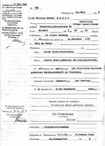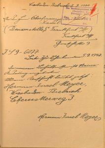 Erstmals tritt Hermann Meyer bei der Registrierung in der Judenkartei der Gestapo, die im Verlauf des Jahres 1938 angelegt wurde, wieder in Erscheinung. Allerdings sind hier keine weiteren Angaben als die ohnehin bekannten festgehalten. Selbst die Tatsache, dass er mit einer nichtjüdischen Frau verheiratet war, ist bei ihr nur durch ein kleines „k“ für katholisch in der Spalte „Religion“ kenntlich gemacht. Als dann die Devisenstelle in Frankfurt am 18. Juli 1940 für ihn eine Devisenakte zur Kontrolle seiner Finanzen anlegte – die einzige Akte, die über die beiden Auskunft gibt –, da wurde auf dem Aktendeckel deutlich in roter Schrift „Ehefrau arisch“ notiert.[13]
