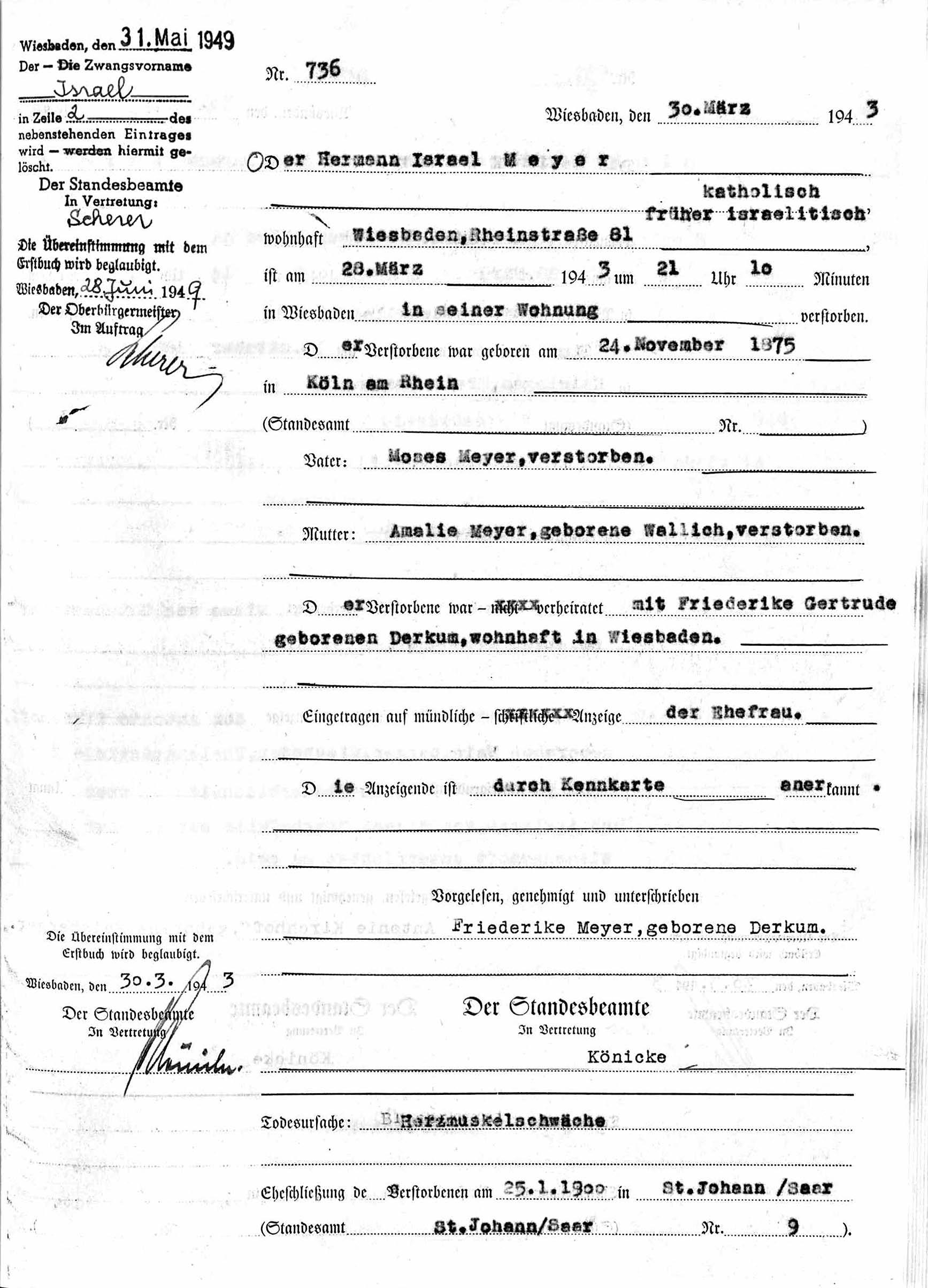 Anfang Februar 1945 wurde ein Teil des Gebäudes durch einen Treffer der britischen ‚Royal Air Force‘ erheblich beschädigt. Inwieweit die Wohnung von Meyers davon tangiert war, ist nicht bekannt. Aber von diesem Ereignis blieb Hermann Meyer selbst ohnehin verschont. Schon lange krank, war er bereits am 28. März 1943, also fast zwei Jahre zuvor, in seiner Wohnung in der Rheinstraße an Herzmuskelschwäche verstorben.[24] Er wurde auf dem städtischen Südfriedhof, nicht auf dem jüdischen Friedhof, beigesetzt.[25]