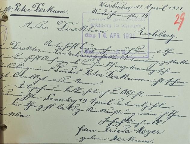 Anlass für die oben erwähnte Postkarte, die die Anwesenheit von Hermann und Frieda Meyer in Wiesbaden spätestens seit 1931 belegt, war ein eher trauriger Anlass, der mit dem Schicksal ihres Bruders Peter zusammenhängt. Dieser befand sich damals in der Heil- und Pflegeanstalt Eichberg bei Kiedrich im Rheingau. Aus seiner Krankenakte erfährt man zumindest etwas über den familiären Hintergrund der katholischen Familie Derkum aus Köln-Nippes.