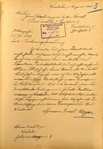 Am selben Tag war auch Hermann Meyer selbst über den geplanten Umzug durch die Bezirksstelle der RVJ unterrichtet worden.[22] Den Formulierungen ist zu entnehmen, dass die Initiative dazu von der Bezirksstelle selbst ausgegangen war, und sie auch das Wohnungsamt und die zuständige Stelle im Finanzamt um entsprechende Maßnahmen gebeten hatte. Auch die Zuweisung des Untermieters Idel Rawinsky erfolgte offenbar durch sie. Auch er erhielt an diesem Tag ein Schreiben der Bezirksstelle, das ihn aufforderte, sich, sobald die Wohnung durch das Finanzamt geräumt worden sei, mit Hermann Meyer wegen des Einzugs in Verbindung zu setzen.[23]