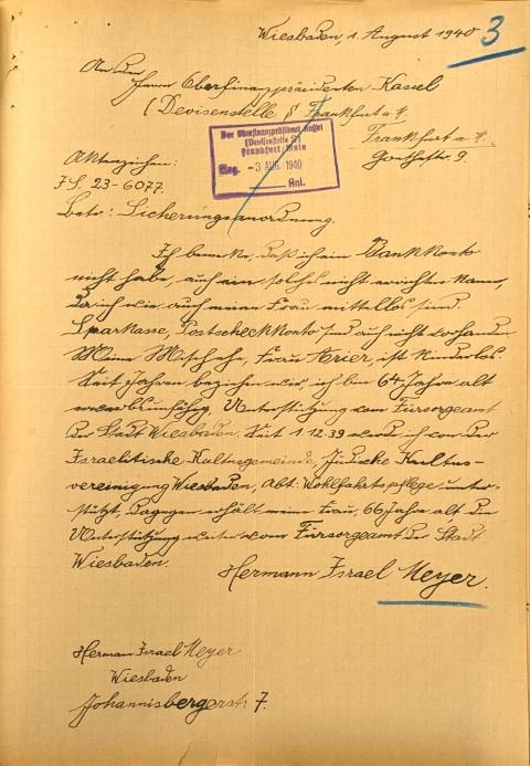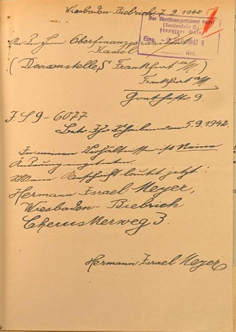 Das Paar lebte damals in der Johannisberger Str. 7, einem Haus, das auch zuvor nicht in jüdischem Besitz gewesen war. Die Forderung, seine finanziellen Verhältnisse gegenüber der Devisenstelle offenzulegen, beantwortete Hermann Meyer am 1. August 1940 mit einem Schreiben, in dem er seine bedrückende Lage schildert: