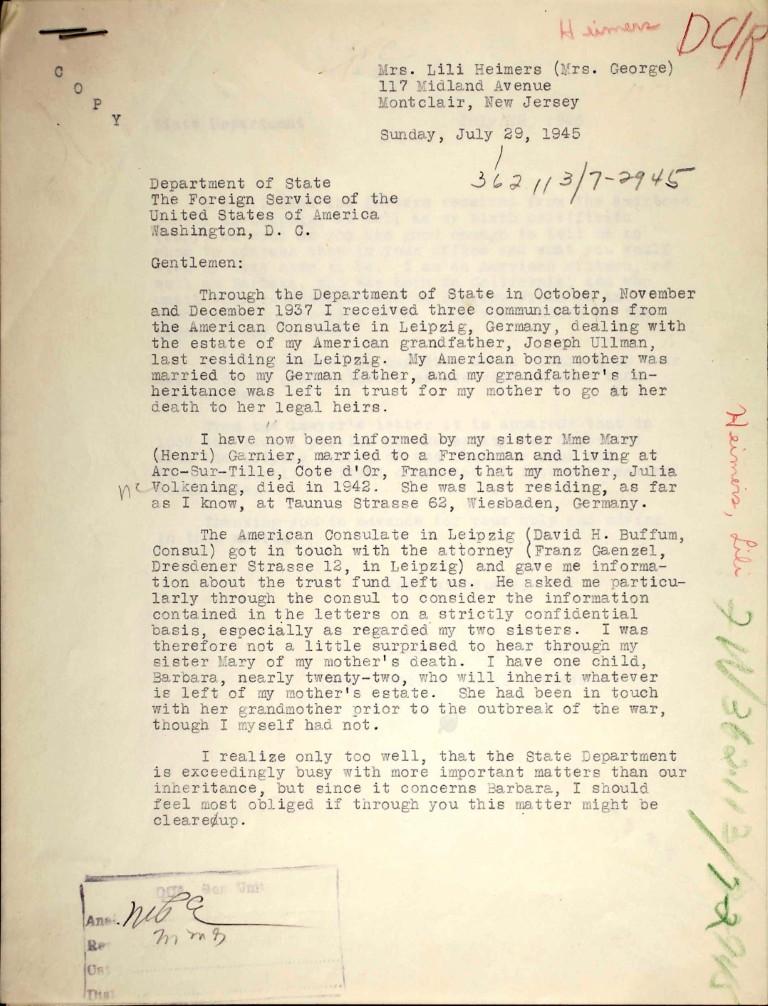 Einen Kontakt zu der Mutter in Wiesbaden scheint es in den letzten Jahren, zumindest von Seiten Lilis, nicht mehr gegeben zu haben. Als sie von Julias Tod durch ihre Schwester Mary informiert wurde, schrieb sie in einem Brief an den Foreign Service im Departement of State: „I was (…) not a little surprised to hear through my sister Mary of my mother’s death. I have one child, Barbara, nearly twenty-two, who will inherit whatever is left of my mother’s estate. She had been in touch with her grandmother prior to the outbreak of the war, though I myself had not.[10]