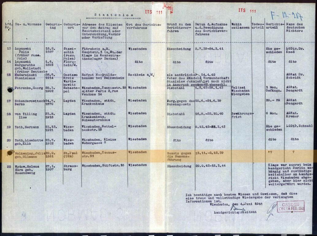 Im Judenhaus Rheinstr. 81 wohnten auch einige Jüdinnen und Juden, die die Zeit der Verfolgung überstanden, zumindest den Deportationen entgingen, da sie durch eine Ehe mit einem nichtjüdischen Partner einen gewissen, aber immer unsicheren Schutz genossen. Eine dieser Bewohnerinnen war Julia Volkening, geborene Ullmann.