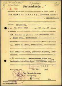 Sie hatte noch miterleben müssen, wie fünf Wochen zuvor etwa 360 Wiesbadener Jüdinnen und Juden in den Osten verbracht worden waren. Und die verbliebenen, zumeist Alten wussten, dass auch ihnen das gleiche Schicksal bald bevorstehen würde. Dass vielen Partnern aus Mischehen sogar noch eine Frist bis ins Frühjahr „geschenkt“ wurde, konnte man damals nicht wissen, hätte für die über 80-jährige Julia Volkening ohnehin nur zusätzliches Leid bedeutet.