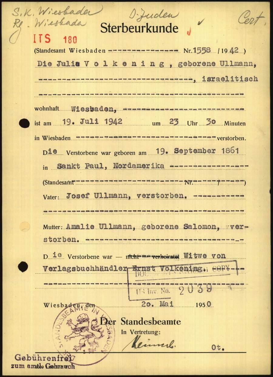 [33] Sterberegister Wiesbaden 1558 / 1942, dazu https://collections-server.arolsen-archives.org/G/wartime/02010101/0691/1221114/002.jpg. (Zugriff: 10.03.2026).