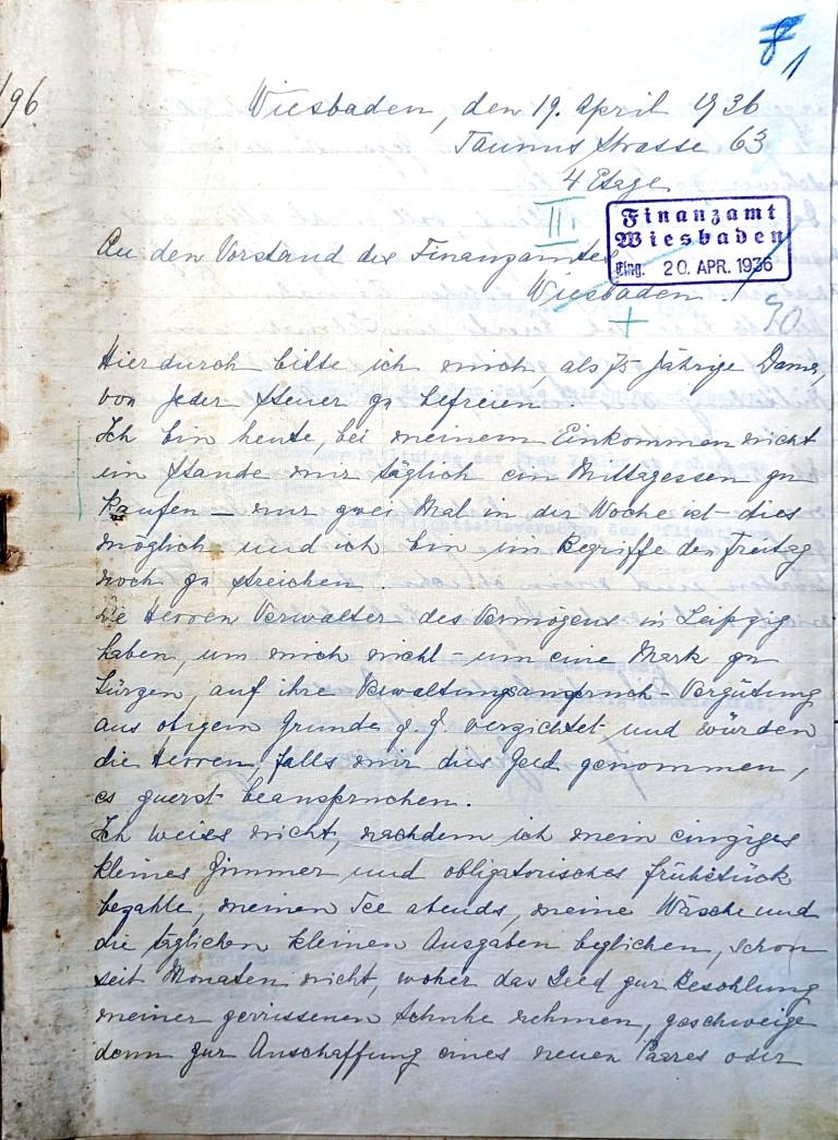 Brief von Julia Volkening an das Finanzamt Wiesbaden vom April 1936