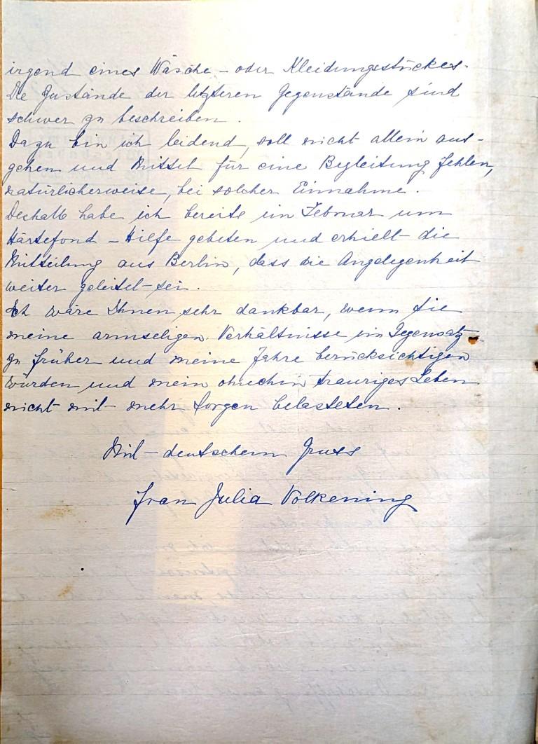 Ich wäre Ihnen sehr dankbar, wenn Sie meine armseligen Verhältnisse im Gegensatz zu früher und meine Jahre berücksichtigen würden und mein ohnehin trauriges Leben nicht mit mehr Sorgen belasteten.
