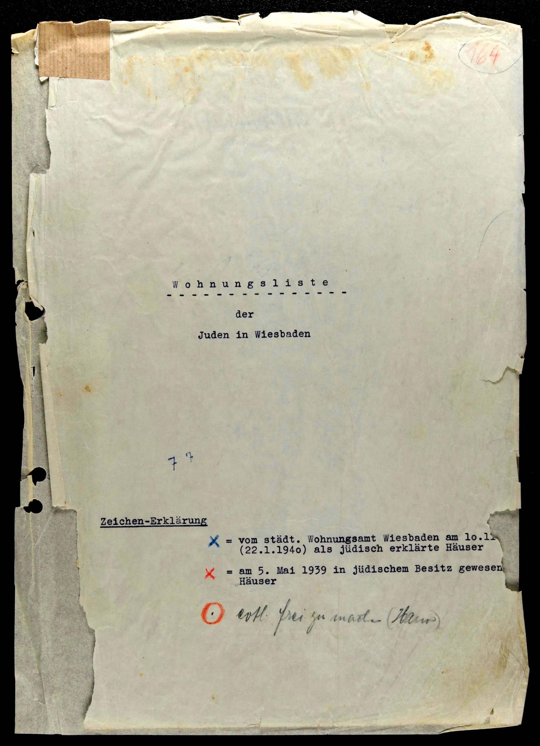 Nachdem im April 1938 das neue Mietgesetz in Kraft gesetzt worden war, begann man auch in Wiesbaden mit der Umsetzung der darin formulierten Absichten. Aus dieser Phase sind drei Listen überliefert, die sich mit dem Komplex Judenhäuser befassen.