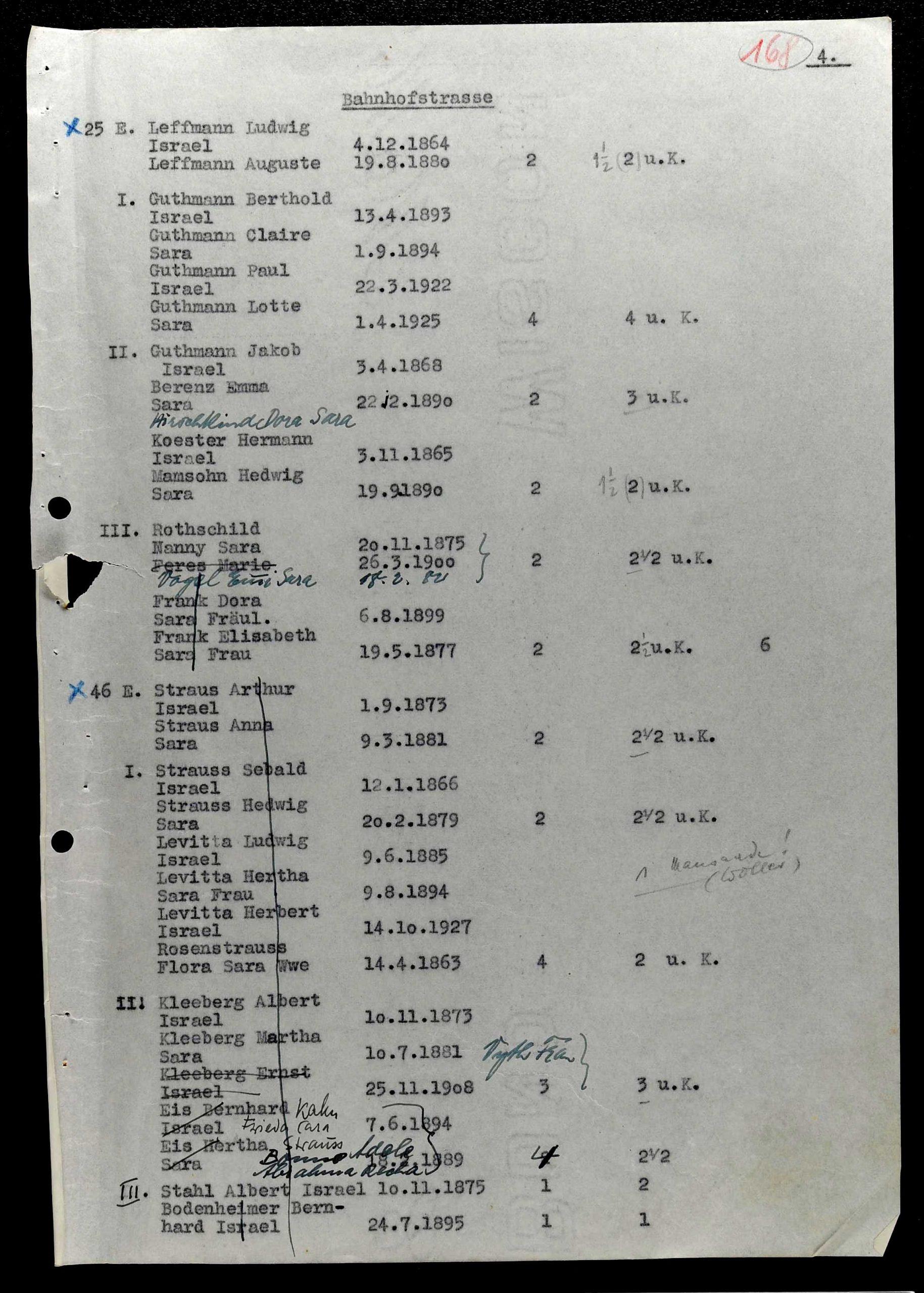 Auf diesem Listendurchschlag, der im HHStAW in doppelter Ausführung existiert, ist jeweils handschriftlich bei 10 Adressen von gleicher Hand der Vermerk „Judenhaus“ gemacht. Auf dem ersten Durchschlag sind die entsprechenden Bewohner mit einem roten Kreuz markiert und deren Name selbst ist schwarz unterstrichen.[33]