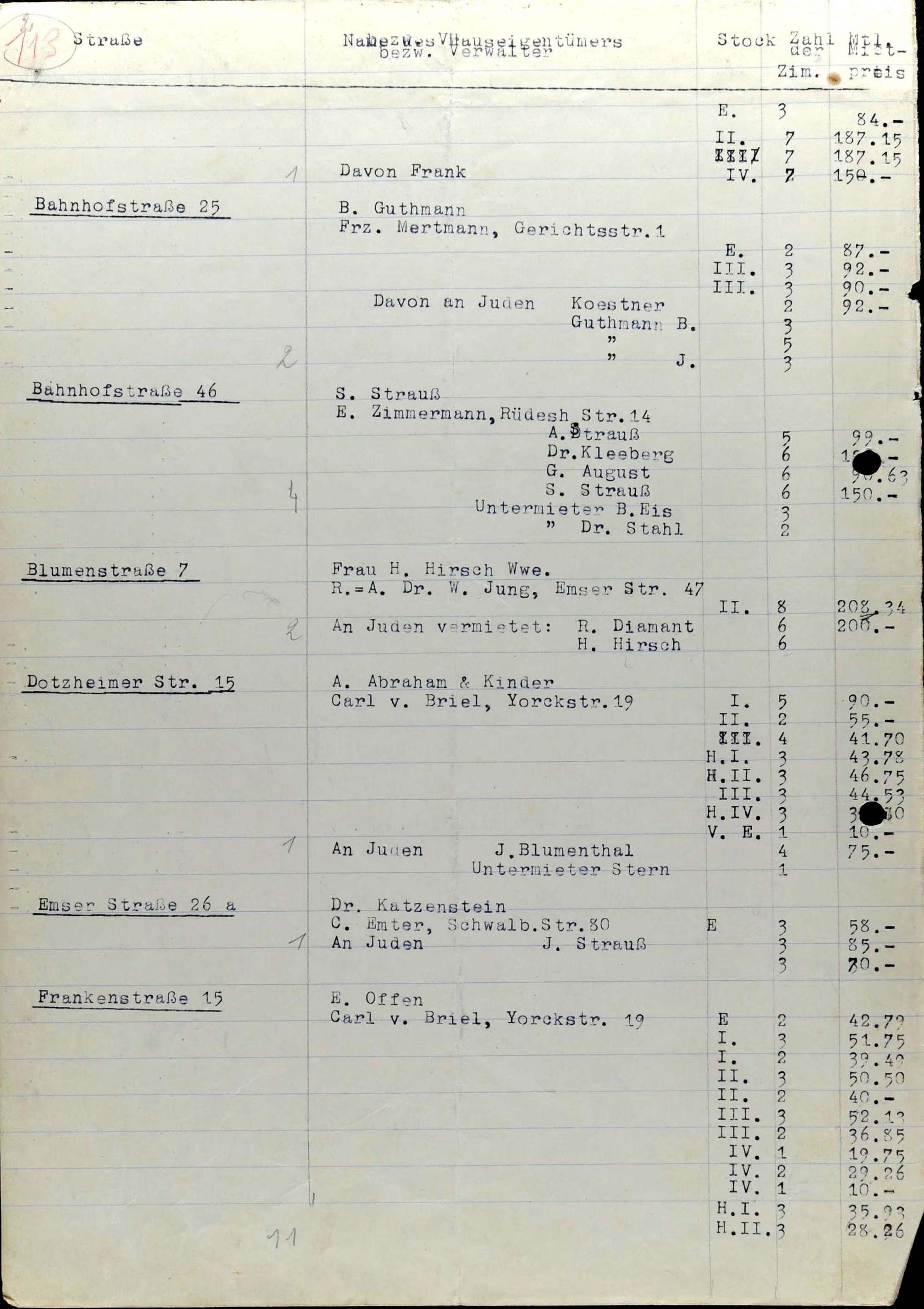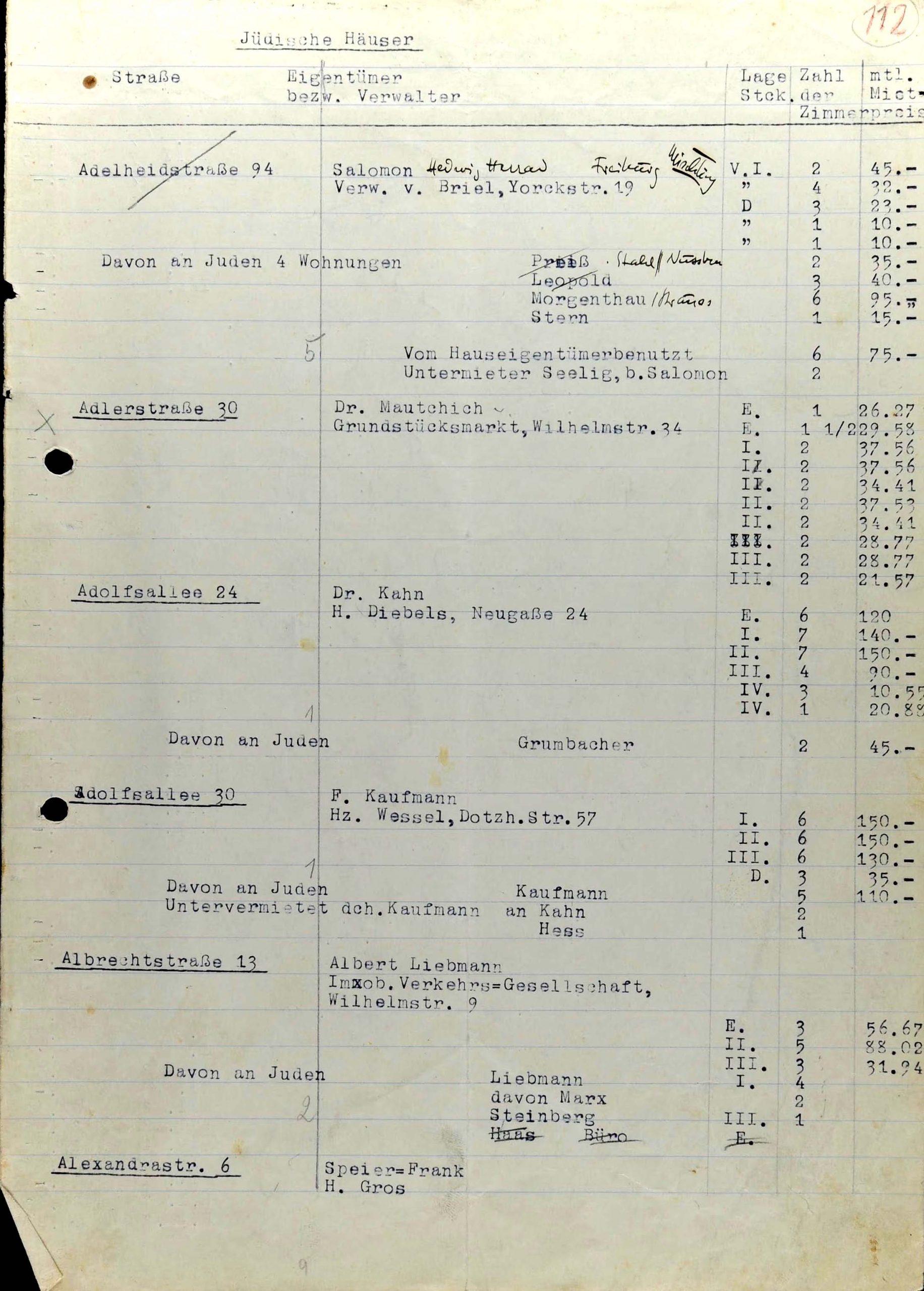 In dieser dem Büro der Reichsvereinigung zuzuordnenden Liste sind, anders als in der zweiten kurzen Aufstellung, neben den Adressen nämlich auch Namen aufgeführt, und zwar die der Hauseigentümer, gegebenenfalls der Hausverwalter und in Kurzform auch die von Mietern und ihren Untermietern zum Zeitpunkt der Erstellung der Liste. Man kann daraus zwar nicht auf die Zahl der damaligen Bewohner schließen, weil sich nicht nur die eigenen Kinder, sondern oft auch andere Familienangehörige die Wohnungen mit den Hauptmietern teilten. Auch sind in der Tabelle weitere Spezifika der Wohnungen selbst festgehalten, z. B. in welcher Etage sie gelegen waren, ob im Vorder- oder Hinterhaus und aus wie vielen Zimmern sie jeweils bestanden. Bis auf den Pfennig genau ist zudem die monatliche Miete aufgeführt.