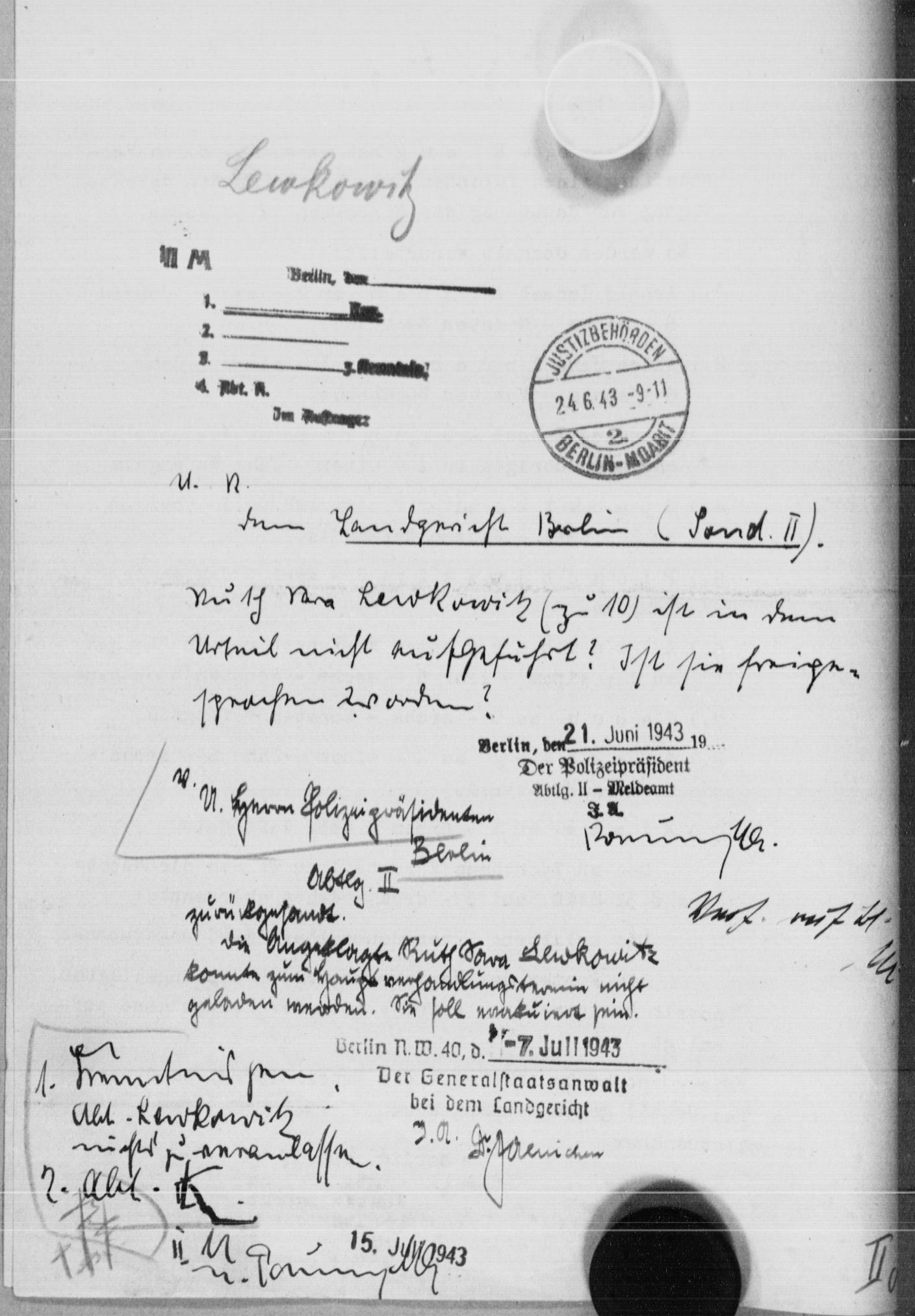In der Reichshauptstadt taucht ihr Name dann mit der Adresse Wilmersdorf, Gasteiner Str. 28, im Rahmen eines Strafprozesses wieder auf.[55] Sie war eine von insgesamt zehn Personen unterschiedlichen Alters, die sich laut Anklage des Passvergehens und der Urkundenfälschung schuldig gemacht hatten. Ob sie untereinander in Verbindung standen, geht aus der Akte nicht hervor. Bei der Auflistung der gefällten Urteile fehlt dann allerdings der Name von Ruth Lewkowitz, weshalb der Polizeipräsident am 21. Juni 1943 beim Generalstaatsanwalt des Landgerichts nachfragte, ob die Angeklagte freigesprochen worden sei. Die knappe Antwort der Behörde vom 7. Juli offenbart das schreckliche Schicksal von Ruth Rachel Lewkowitz: „Die Angeklagte Ruth Sara Lewkowitz konnte zum Gerichtsverhandlungstermin nicht geladen werden. Sie soll evakuiert sein.“[56] Laut Gedenkbuch des Bundesarchivs Koblenz war sie am 12. März 1943 von Berlin aus nach Auschwitz überstellt worden.[57] Wann sie dort ermordet wurde, ist nicht bekannt.