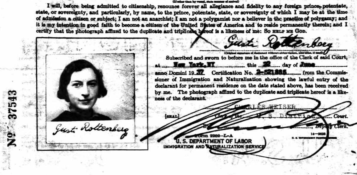 Noch mindestens zweimal kehrte er in den zwanziger Jahren nach Europa bzw. zurück. Wenn man die Kosten solcher Schiffsreisen bedenkt, dann kann man daraus schließen, dass es ihm in Amerika gelungen war, Fuß zu fassen. Im Oktober 1940 wurde er, noch immer in New York wohnend, für die Army registriert. Am 3. März 1942 heiratete er in New York Bertha Bressler, geborene Rand,[31] die, wie die Vorfahren von Hermann, aus Polen stammte, aber schon 1920 mit ihren Eltern Baruch und Rose Rand sowie ihren Geschwistern nach Amerika ausgewandert war.[32] Ob aus der Ehe Kinder hervorgingen, ist nicht bekannt. Sein 1939 gestellter Antrag auf Erteilung der amerikanischen Staatsbürgerschaft, wurde 1944 bewilligt.[33] Herman Rottenberg wurde nicht einmal 60 Jahre alt. Er verstarb am 11. August 1955 in New York, bevor das Entschädigungsverfahren für seine Eltern zu ihrem Ende gekommen war.[34]