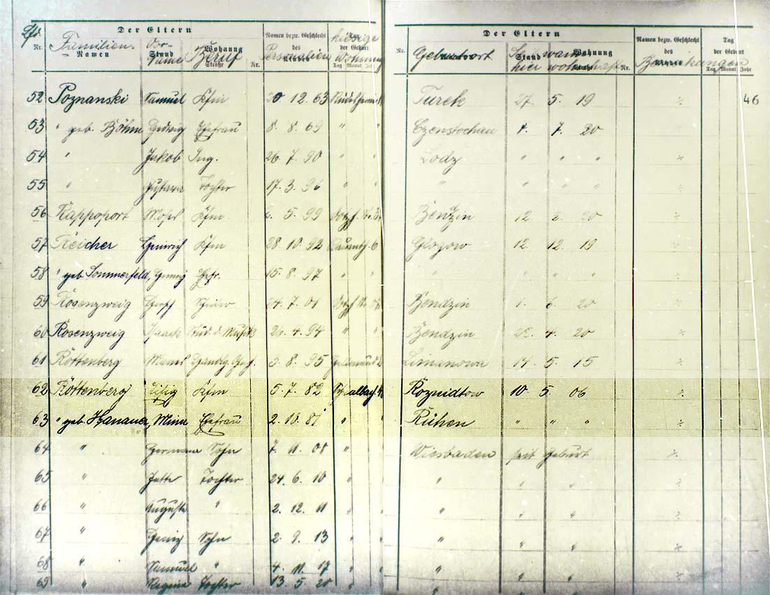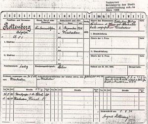 Dem Erlass der Reichsregierung kam auch die Stadt Wiesbaden nach und erstellte anhand der Unterlagen des Meldeamts entsprechende Listen. In dieser Liste ist auch Philipp Rottenberg aufgenommen, der danach seit dem 10. Mai 1906 in der Stadt gemeldet war.[7] Allerdings wirft dieser Eintrag weitere Fragen auf. Zunächst muss man fragen, wieso er überhaupt in dieser Liste erscheint, denn sein Geburtsort bei Groß Strelitz lag zum Zeitpunkt seiner Geburt im Deutschen Reich. Und auch nach dem Ersten Weltkrieg und den in Oberschlesien abgehaltenen Abstimmungen über die territoriale Zugehörigkeit blieb dieses umstrittene Gebiet bei Deutschland. Möglicherweise waren seine Eltern polnische Staatsbürger und diese Staatsangehörigkeit war dann auf ihn übertragen worden. Offenbar betrachtete sich die Familie selbst auch als polnische Juden, denn nie hat sie diese Zuschreibung, die ihr eher Probleme als Vorteile bereitete, je infrage gestellt und dagegen protestiert.[8] All die Jahre zuvor war sie auch von der Polizei als Polen geführt und von ihren Mitbürgern auch als solche behandelt worden.