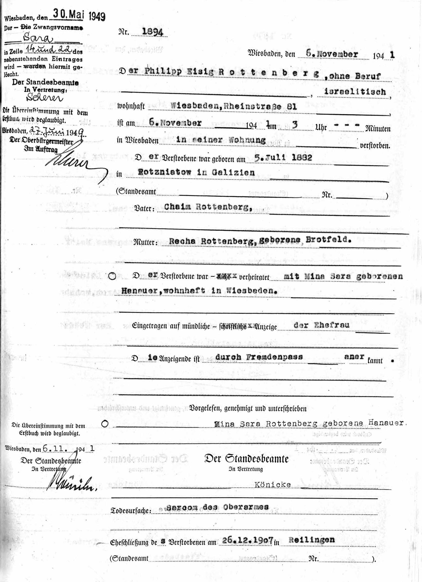 Wieso sie die Ausreise nicht antraten bzw. nicht antreten konnten, ist aber nicht dokumentiert. Möglicherweise hatten sie wegen des hohen Alters ihrer Mitbewohnerin Fanny Hanauer schon die ganzen Jahre mit der Ausreise gezögert. Wer sollte sich um die alte Frau kümmern? Vielleicht hatten sie zu lange gewartet und Kontingentsnummern für ihre Visen erhalten, die zu hoch waren und ihnen keine Chance mehr boten. Wahrscheinlicher ist aber eine andere Möglichkeit. Zwar ist nicht bekannt, wann die Krebserkrankung erstmals diagnostiziert wurde, an der Eisig Philipp Rottenberg am 6. November 1941 in Wiesbaden in seiner Wohnung verstarb, [62] aber die kleinste Erkrankung war für die amerikanischen Einwanderungsbehörden hinreichender Grund, eine Immigration abzulehnen. Somit war der Zeitraum von 1939 bis 1941 nicht nur von den bedrückenden politischen Umständen geprägt, sondern auch durch die zusätzliche persönliche Leidensgeschichte von Philipp Rottenberg.